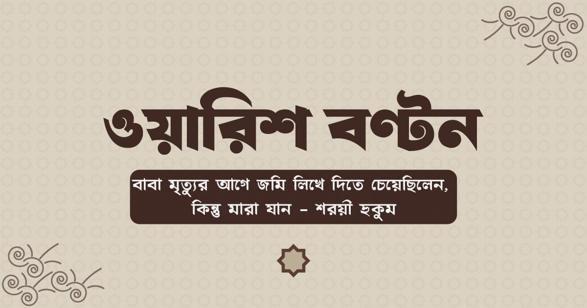 প্রশ্ন: আমার ভাইয়েরা বাবা-মার খোঁজখবর রাখতেন না। আমি একাই তাদের দেখভাল করেছি। বাবা মৃত্যুর আগে আমাকে ৫ শতাংশ জমি আলাদা করে লিখে দিতে চেয়েছিলেন। কিন্তু আকস্মিক মৃত্যুর কারণে তা আর সম্ভব হয়নি। এখন ওয়ারিশ বণ্টনের সময় কি সেই ৫ শতাংশ বাদ দিয়ে বাকি জমি বণ্টন হবে নাকি তা সহ মোট সম্পত্তি একসাথে বণ্টন হবে? বিষয়টি জানালে উপকৃত হবো।